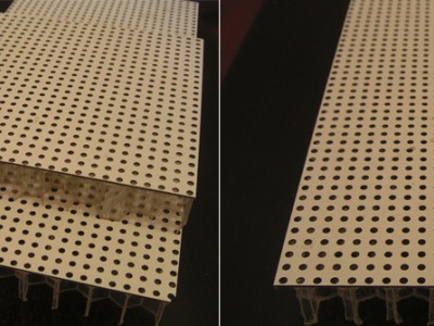 使用方法:用于吸音的蜂窝板,孔径一般选用12mm,两面有无纺布,厚度在25-80mm之间,尺寸按用户要求。面板一般选用小孔铝板或彩钢板,粘合剂复合。背面可贴任何板材,也可贴无纺布。