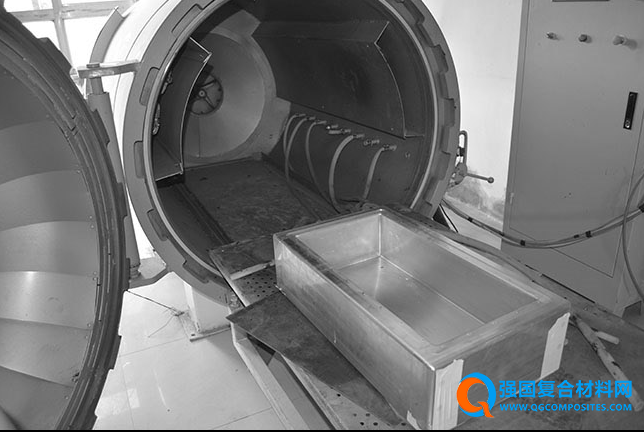 将碳纤维预浸料按铺层要求铺放于模具上,将毛坯密封在真空袋后放置于碳纤维热压罐中。在真空状态下,经过热压罐设备升温、加压、保温、降温和卸压等程序,利用热压罐内同时提供的均匀温度和均布压力实现固化,从而可以形成表面与内部质量高、形状复杂、面积巨大的碳纤维复合材料制件。