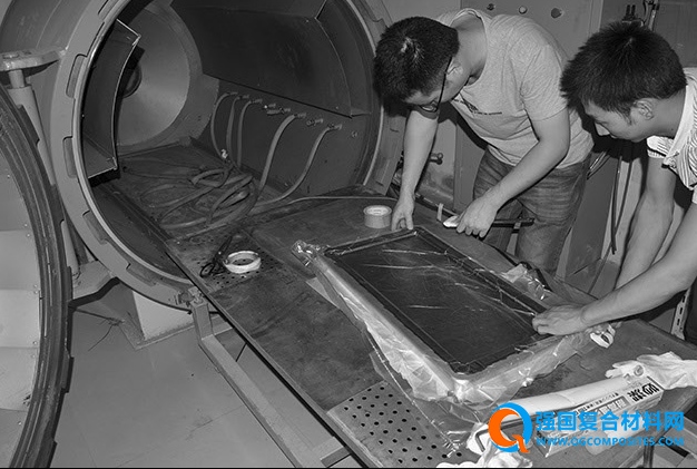 铺层之后要将制品在模具上进行定位组装,封装真空袋。在封装过程中要不断用压辊等工具隔着真空袋表面对预浸料做再一次的修整,尽量压出空气,使预浸料经历树脂流动、树脂固化、纤维密实等过程后,最终实现固化。