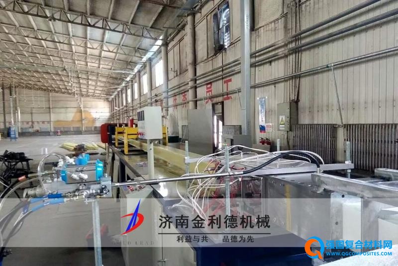 玻璃钢乙烯基树脂拉挤生产线是由PLC控制,液压往复牵引、气动定长切割为一体的成套生产机组。机组由纱架、浸胶槽、定型台、往复牵引机、切割锯、制品堆放架、控制系统等组成。