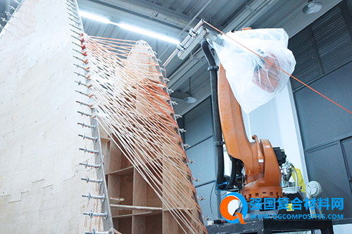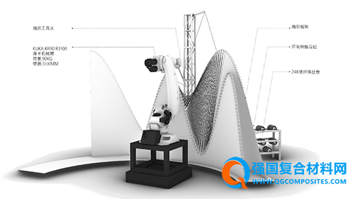 大界机器人率先引入欧洲最先进的机器人纤维编织建造技术,并进行研发改进创造新的专利技术。数卷玻璃纤维丝在纱架上汇聚成一束,通过定制调色环氧树脂形成玻璃纤维复合材料,并由机器人自主识别几何形态,生成编织的运动路径规划。本装置的各组纤维模块形态迥异,大界通过智能的优化算法,通过三组木模具的自由组合实现了声波装置形态的千变万化。