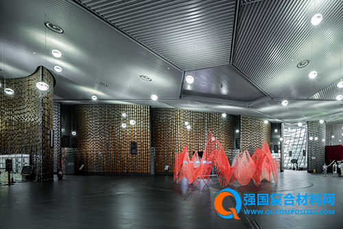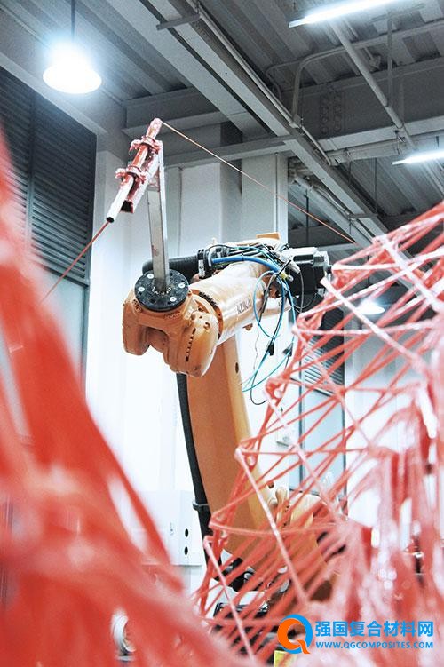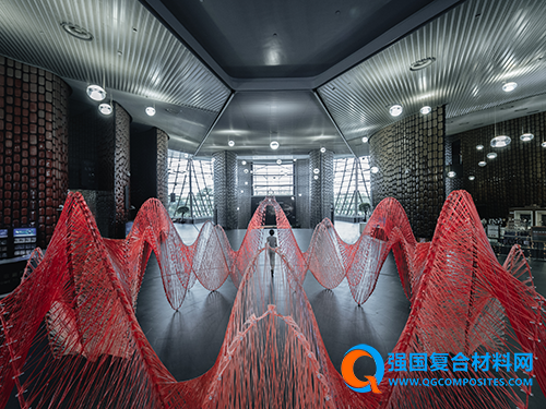 整个装置由玻璃纤维复合材构成,色调以渐变红色为主,由下往上从浅红到深红,创造出空间的温暖感,也仿佛灵感的火焰。最后这个装置直径八米,最高高度达到3.4米,采用形式结构一体化的设计,分成了16组纤维模块,而总重量仅为240公斤。装置采用了机器人数字化建造技术来完成。
